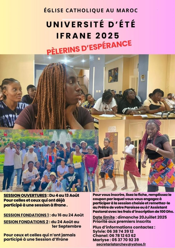 Comme chaque année, l’Église catholique au Maroc organise son incontournable Université d’été à Ifrane, un temps fort de formation, de prière, de rencontre et de joie destiné aux jeunes chrétiens du pays. L’édition 2025 se tiendra sous le thème « Pèlerins d’espérance », dans un esprit de communion, de fraternité et d’engagement.